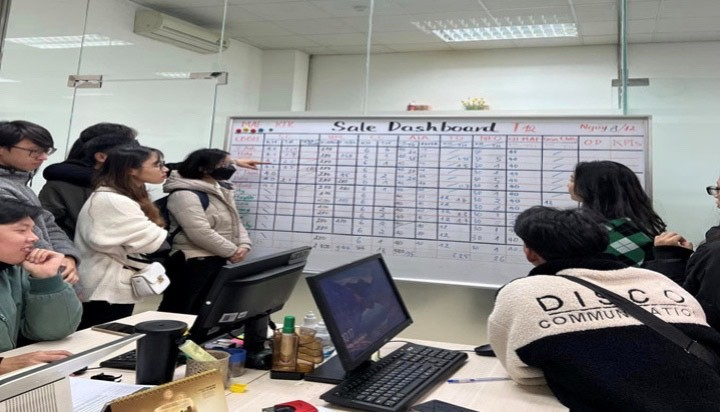 Chị Trang sôi nổi hướng dẫn các em SV cách hiểu và đọc bảng chỉ tiêu kế hoạch tại đơn vị