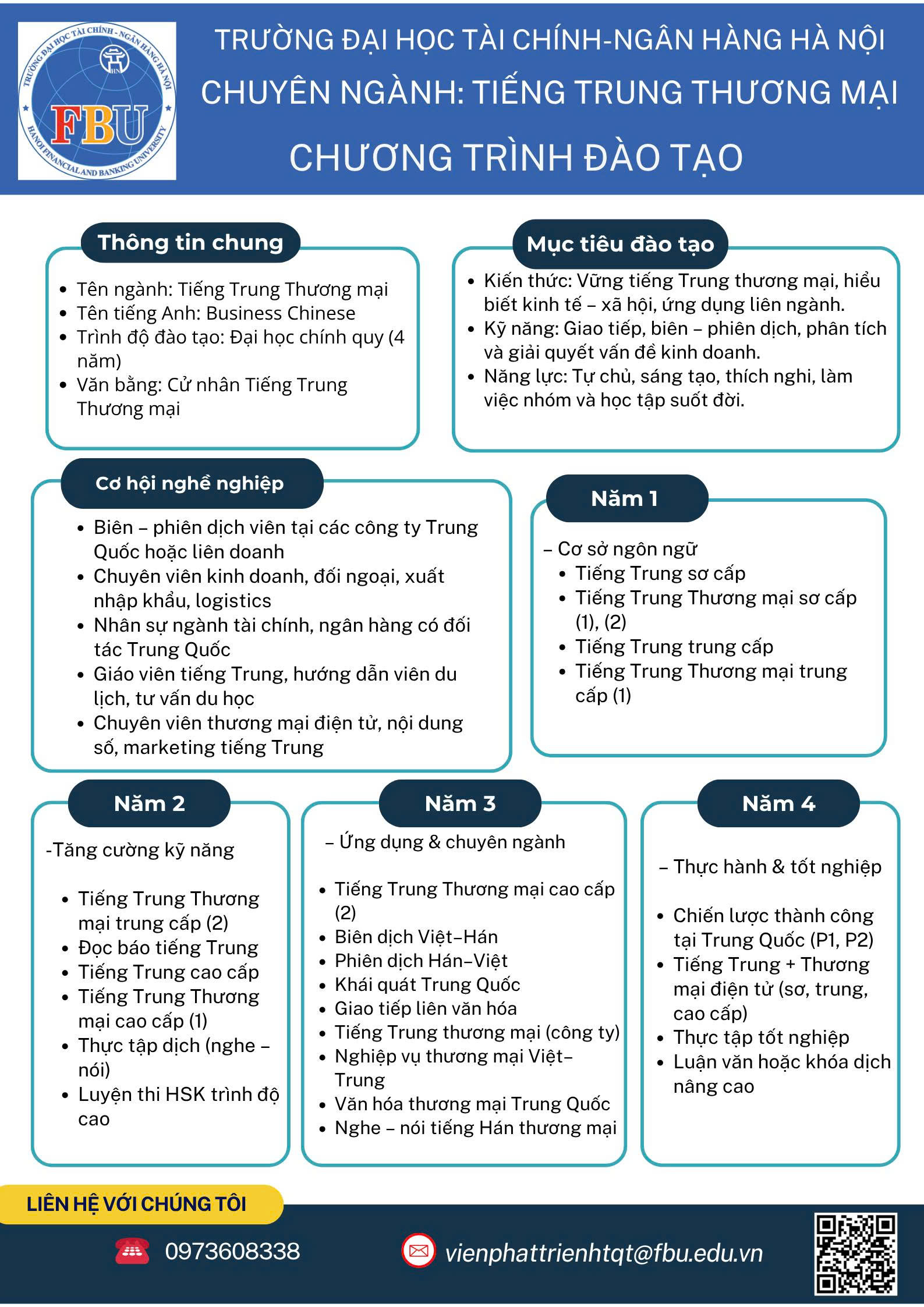 Chương trình đào tạo Tiếng Trung Thương mại tại Trường Đại học Tài chính – Ngân hàng Hà Nội (FBU) hướng đến mục tiêu cung cấp nguồn nhân lực chất lượng cao, có khả năng sử dụng thành thạo tiếng Trung trong lĩnh vực thương mại và tài chính. Chương trình đào tạo nhằm phát triển toàn diện kỹ năng ngôn ngữ, giúp sinh viên đáp ứng yêu cầu ngày càng cao của thị trường lao động trong môi trường hội nhập quốc tế. Đồng thời, chương trình chú trọng rèn luyện phẩm chất đạo đức, bản lĩnh nghề nghiệp và khả năng làm việc nhóm, giúp sinh viên có thể thích ứng và phát triển trong môi trường làm việc tại các quốc gia sử dụng tiếng Trung.